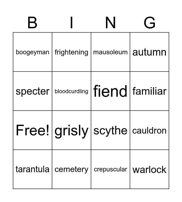 This bingo card has 20 words: cauldron, apparition, mausoleum, seance, tarantula, specter, cemetery, boogeyman, Free!, frightening, grisly, scythe, bloodcurdling, warlock, fiend, werewolf, familiar, autumn, crepuscular and oubliette.