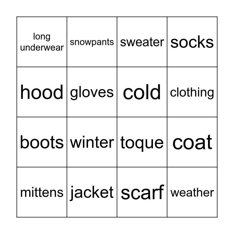 This bingo card has 16 words: jacket, coat, sweater, long underwear, boots, snowpants, toque, scarf, hood, gloves, mittens, socks, winter, clothing, cold and weather.