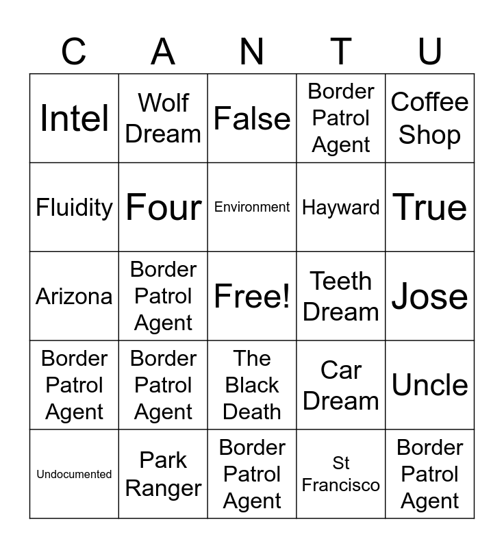 This bingo card has a free space and 24 words: Border Patrol Agent, Park Ranger, Environment, Undocumented, Coffee Shop, Intel, Fluidity, Wolf Dream, Teeth Dream, The Black Death, Hayward, Arizona, Car Dream, Uncle, Four, St Francisco, Jose, False, True, Border Patrol Agent, Border Patrol Agent, Border Patrol Agent, Border Patrol Agent and Border Patrol Agent.