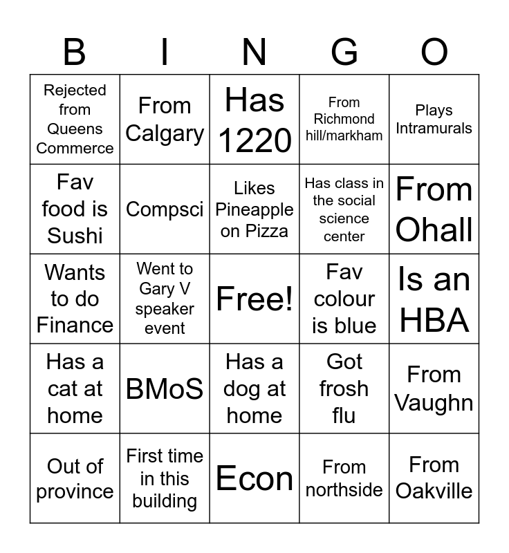 This bingo card has a free space and 24 words: BMoS, First time in this building, Likes Pineapple on Pizza, Out of province, Plays Intramurals, Rejected from Queens Commerce, Fav food is Sushi, From Calgary, Fav colour is blue, Has a dog at home, Has class in the social science center, Wants to do Finance, Got frosh flu, From Vaughn, Compsci, From northside, Is an HBA, Has 1220, From Ohall, Went to Gary V speaker event, From Oakville, Has a cat at home, From Richmond hill/markham and Econ.