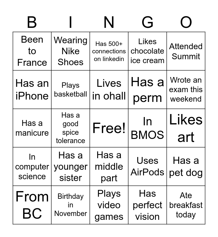 This bingo card has a free space and 24 words: Has a younger sister, Birthday in November, Lives in ohall, From BC, Attended Summit, Been to France, Has an iPhone, Wearing Nike Shoes, In BMOS, Has a middle part, Has a perm, Has a manicure, Uses AirPods, Has a pet dog, Plays basketball, Has perfect vision, Likes art, Has 500+ connections on linkedin, Wrote an exam this weekend, Has a good spice tolerance, Ate breakfast today, In computer science, Likes chocolate ice cream and Plays video games.