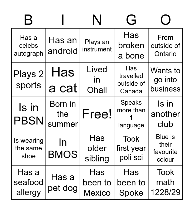 This bingo card has a free space and 24 words: In BMOS, Has a pet dog, Lived in Ohall, Has a seafood allergy, From outside of Ontario, Has a celebs autograph, Plays 2 sports, Has an android, Speaks more than 1 language, Has older sibling, Has travelled outside of Canada, Is in PBSN, Took first year poli sci, Blue is their favourite colour, Has a cat, Has been to Spoke, Is in another club, Plays an instrument, Wants to go into business, Born in the summer, Took math 1228/29, Is wearing the same shoe, Has broken a bone and Has been to Mexico.