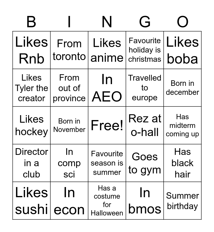 This bingo card has a free space and 24 words: In comp sci, In econ, In AEO, Likes sushi, Likes boba, Likes Rnb, Likes Tyler the creator, From toronto, Rez at o-hall, Favourite season is summer, Travelled to europe, Likes hockey, Goes to gym, Has black hair, From out of province, In bmos, Has midterm coming up, Likes anime, Born in december, Born in November, Summer birthday, Director in a club, Favourite holiday is christmas and Has a costume for Halloween.