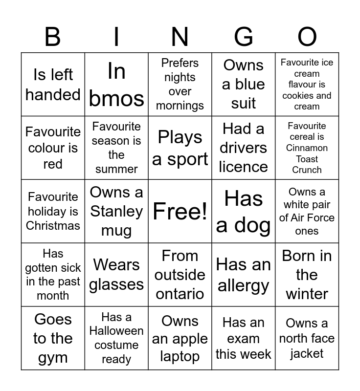 This bingo card has a free space and 24 words: Wears glasses, Has a Halloween costume ready, Plays a sport, Goes to the gym, Favourite ice cream flavour is cookies and cream, Is left handed, Favourite colour is red, In bmos, Has a dog, From outside ontario, Had a drivers licence, Favourite holiday is Christmas, Has an allergy, Born in the winter, Favourite season is the summer, Has an exam this week, Owns a white pair of Air Force ones, Prefers nights over mornings, Favourite cereal is Cinnamon Toast Crunch, Owns a Stanley mug, Owns a north face jacket, Has gotten sick in the past month, Owns a blue suit and Owns an apple laptop.