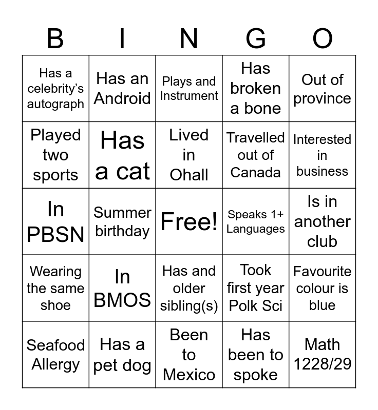 This bingo card has a free space and 24 words: In BMOS, Has a pet dog, Lived in Ohall, Seafood Allergy, Out of province, Has a celebrity’s autograph, Played two sports, Has an Android, Speaks 1+ Languages, Has and older sibling(s), Travelled out of Canada, In PBSN, Took first year Polk Sci, Favourite colour is blue, Has a cat, Has been to spoke, Is in another club, Plays and Instrument, Interested in business, Summer birthday, Math 1228/29, Wearing the same shoe, Has broken a bone and Been to Mexico.