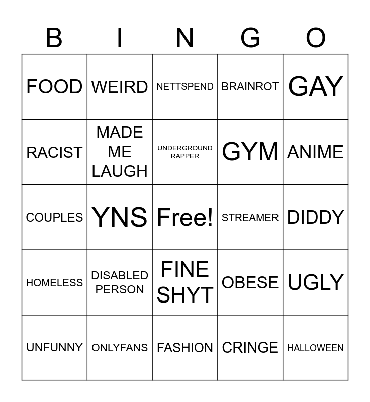 This bingo card has a free space and 24 words: DISABLED PERSON, ONLYFANS, UNDERGROUND RAPPER, UNFUNNY, GAY, FOOD, RACIST, WEIRD, STREAMER, FINE SHYT, GYM, COUPLES, OBESE, UGLY, MADE ME LAUGH, CRINGE, DIDDY, NETTSPEND, ANIME, YNS, HALLOWEEN, HOMELESS, BRAINROT and FASHION.