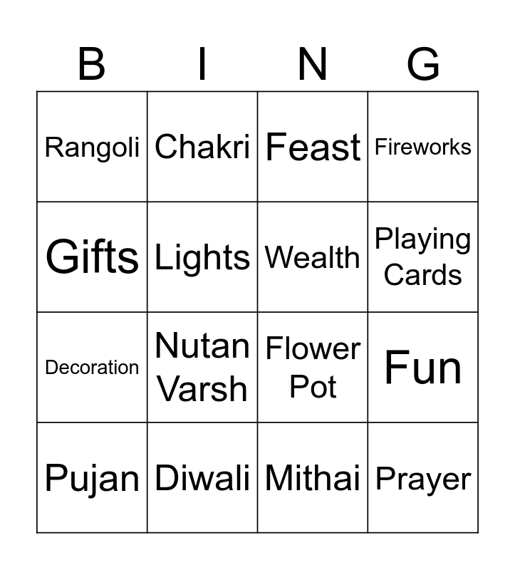 This bingo card has 32 words: Free!, Crackers, Mithai, Cashews, Lamp, Lights, Feast, Prayer, Gifts, Prosperity, Wealth, Fireworks, Goddess Lakshmi, Evil, Darkness, Tradition, Good, Nutan Varsh, Flower, Fun, Celebration, Sparklers, Labh, Shubh, Pujan, Chakri, Flower Pot, Playing Cards, Rangoli, Diwali, Ganesha and Decoration.