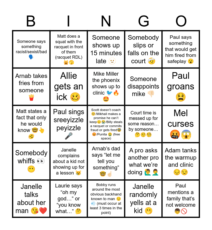 This bingo card has a free space and 66 words: Janelle hits someone with a racquet ๐, Arnab apologizes ๐, Paul brags about the line game ๐, Adam tanks the warmup and clinic๐๐, Aiden smashes his racquet on his calf๐ฆต, Janelle gets excited when she gets to pick a sprint ๐ฐ, Matt does a squat with the racquet in front of them (racquet RDL) ๐๐ซฃ, Santi gets frustrated at kids ๐ก, Mike Miller the phoenix shows up to clinic ๐ฆโ๐ฅ๐คฉ, Carson says someone is tanking or a bot or an npc or AI ๐ค, Arnabโs dad says โlet me tell you somethingโ ๐คโ๐ป, Carson/matt asks for kombucha ๐๐บ, Mel curses๐คฌ๐ฑ, Paul says something that would get him fired from safeplay ๐ฎ, Arnab gets sweat on everyone near him when he hits a ball ๐ฆ๐ญ, Arnab takes fries from someone ๐, Paul sings sreeyizzle peyizzle ๐ค, Someone says something racist/sexist/bad ๐ฃ๏ธ, Carson intimidates a kid ๐คฌ, Someone disappoints mike ๐๐ป, Janelle complains about a kid not showing up for a lesson ๐ฟ, Somebody whiffs ๐๐ถ, Somebody slips or falls on the court ๐ค, A pro gives Matt a talking to ๐๐, Janelle says something really white ๐ฅธ๐บ๐ธ, We have story time ๐ฅณ๐ค, Matt does a squat ๐, Santi tells a kid theyโre not trying hard enough ๐, Paul mentions a family thatโs not welcome ๐ฆ๐ซ, We steal a kid from Billyโs club ๐๐คฉ, Janelle talks about her man ๐โค๏ธ, Sreeyash/allie vapes ๐ฎโ๐จ, Carson tells a kid that they suck ๐ข, Mel makes a kid suffer during fitness ๐ต, A pro asks another pro what weโre doing ๐โโ๏ธ๐คฆโโ๏ธ, Laurie says โoh my godโฆโ or โyou know whatโฆโ ๐ค, Santi complains about his back ๐, Matt states a fact that only he would know ๐ค๐๐ซจ, Janelle randomly yells at a kid ๐ซข, A pro makes everyone redo the warmup ๐ฌ๐ญ, Allie gets an ick ๐ฅด, Paul does an accent ๐ค ๐, Court time is messed up for some reasonโฆ by someoneโฆ ๐ค๐คจ๐ง, We take a 5 minute break ๐ฅณ๐คฉ, Paul puts something in Elisaโs slippers /shoes๐, Laurie accidentally insults someone ๐ณ๐ซข, Paul groans ๐ซ, Noah laughs after a point ๐คญ, Bobby plays in and has the highest intensity ever ๐, Someone falls ๐ค๐ต, Carson says โI can make that left handedโ when a player misses an easy ball ๐คก, John/Jasper/Gabe say they canโt hit a forehand ๐ฅ๐ฐ๐, Gabe mentions UTR ๐ค๐(double points if he mentions the exact UTR of a random player), Jasper fist pumps after losing a point โ, Arnab claps his racket after the most mediocre shot with his arms fully extended ๐๐๐, Someone says theyโre going to kill themselves โบ๏ธ๐ซ, Aiden drops an f-bomb ๐คฌ๐ผ (must occur at least 5 times), Someone misses an overhead ๐คซ, Someone shows up 15 minutes late ๐ซฅ, Bobby runs around the most obvious backhand known to man ๐๐จ (must occur at least 3 times in the point), Someone hits a lucky net shot โบ๏ธ๐ซ๐คฌ, Adam hits a one-handed backhand ๐๐โโ๏ธ, Santi gives us a talking to/lecture ๐, Someone gets hit by a ball ๐ค๐ต, Paul makes up an atrocious nickname for someone ๐ญ๐ and Adam says something super out of pocket ๐.