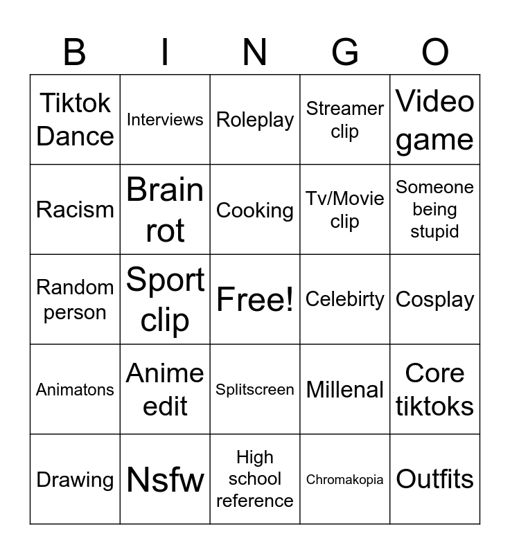 This bingo card has a free space and 24 words: Anime edit, Nsfw, Cooking, Drawing, Video game, Tiktok Dance, Racism, Interviews, Celebirty, Splitscreen, Tv/Movie clip, Random person, Millenal, Core tiktoks, Brain rot, Chromakopia, Cosplay, Roleplay, Someone being stupid, Sport clip, Outfits, Animatons, Streamer clip and High school reference.