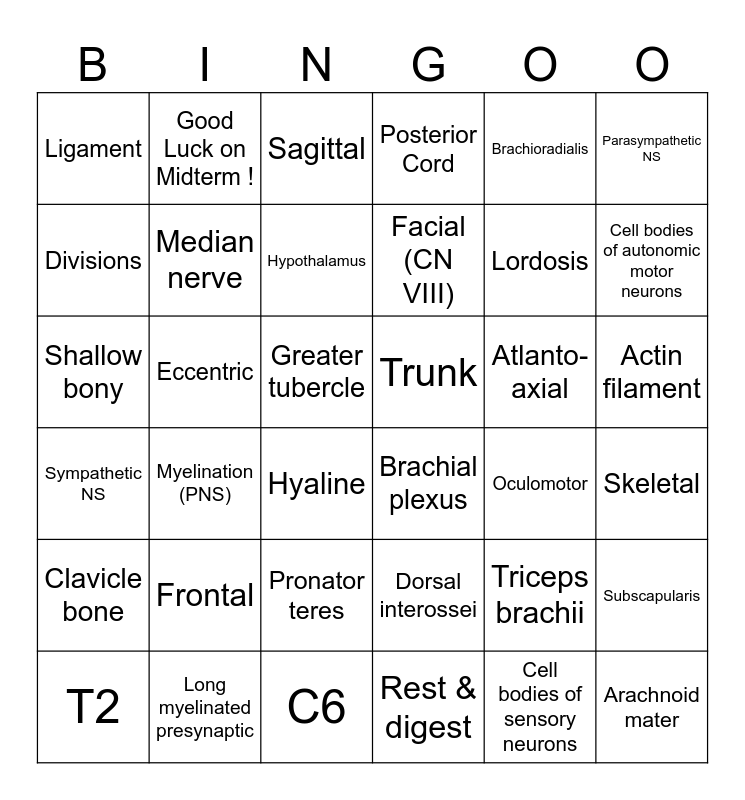 This bingo card has 36 words: Sympathetic NS, Myelination (PNS), C6, Facial (CN VIII), Atlanto-axial, Actin filament, Ligament, Long myelinated presynaptic, Sagittal, Dorsal interossei, Lordosis, Parasympathetic NS, Clavicle bone, Eccentric, Hypothalamus, Posterior Cord, Triceps brachii, Skeletal, Divisions, Median nerve, Hyaline, Brachial plexus, Oculomotor, Subscapularis, Shallow bony, Good Luck on Midterm !, Greater tubercle, Rest & digest, Brachioradialis, Cell bodies of autonomic motor neurons, T2, Frontal, Pronator teres, Trunk, Cell bodies of sensory neurons and Arachnoid mater.