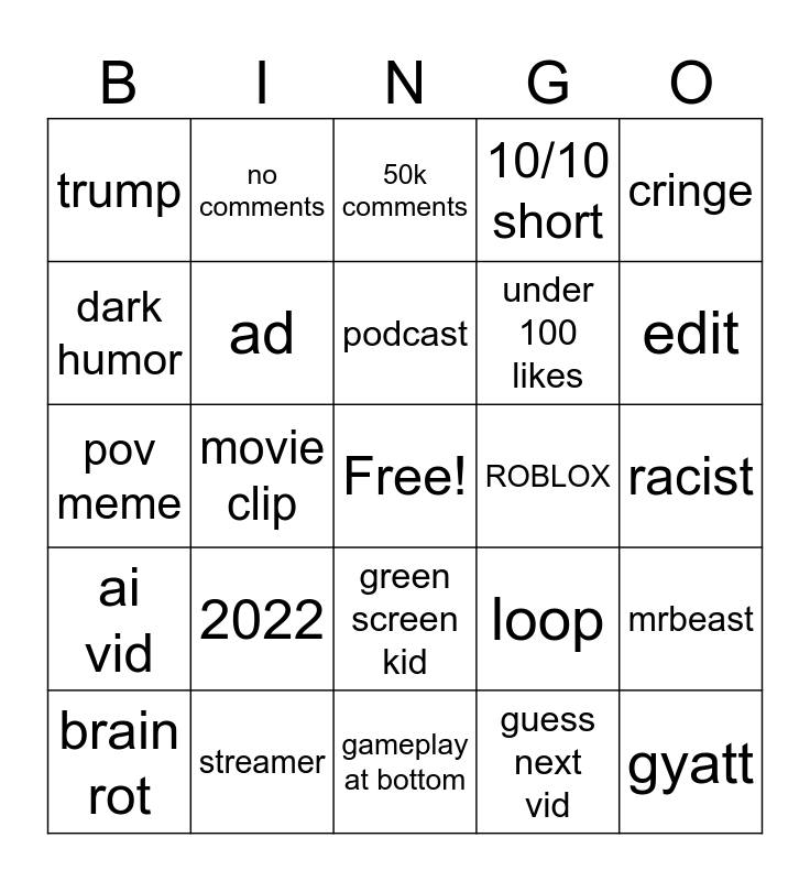 This bingo card has a free space and 24 words: 2022, streamer, podcast, brain rot, cringe, trump, dark humor, no comments, ROBLOX, green screen kid, under 100 likes, pov meme, loop, mrbeast, ad, guess next vid, racist, 50k comments, edit, movie clip, gyatt, ai vid, 10/10 short and gameplay at bottom.