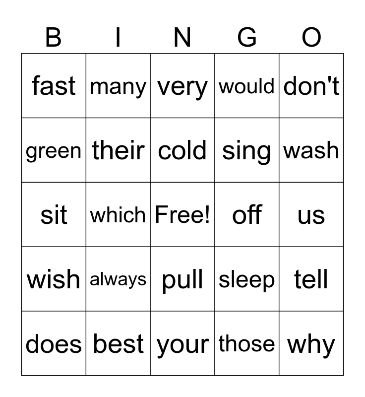 This bingo card has a free space and 24 words: always, best, cold, does, don't, fast, green, many, off, pull, sing, sit, sleep, tell, their, those, us, very, wash, which, why, wish, would and your.