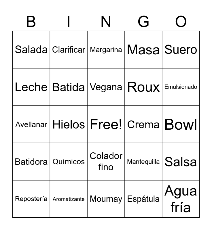 This bingo card has a free space and 27 words: Mantequilla, Nata, Roux, Mournay, Leche, Margarina, Clarificar, Batidora, Crema, Salsa, Avellanar, Masa, Repostería, Aromatizante, Emulsionado, Compuesta, Batida, Vegana, Químicos, Salada, Bowl, Espátula, Hielos, Agua fría, Colador fino, Suero and Sumerios.