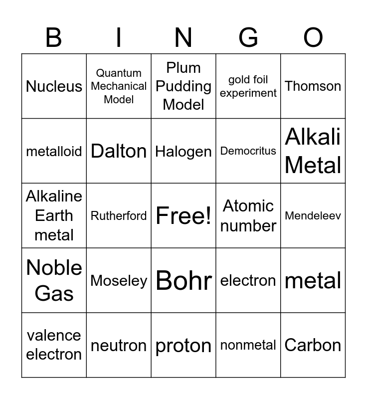 This bingo card has a free space and 24 words: Moseley, neutron, Halogen, valence electron, Thomson, Nucleus, metalloid, Quantum Mechanical Model, Atomic number, Bohr, Democritus, Alkaline Earth metal, electron, metal, Dalton, nonmetal, Mendeleev, Plum Pudding Model, Alkali Metal, Rutherford, Carbon, Noble Gas, gold foil experiment and proton.