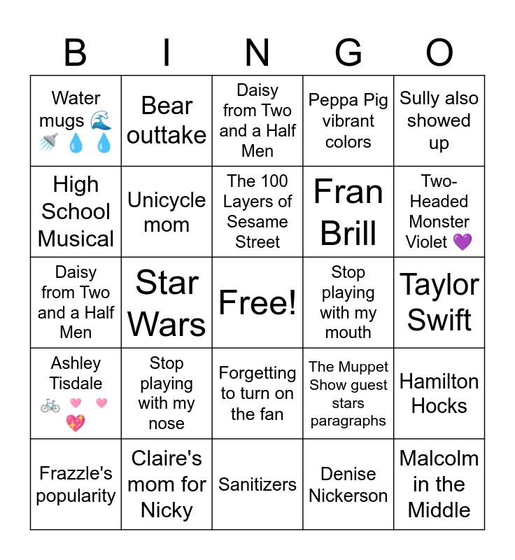 This bingo card has a free space and 39 words: 45 Muppets list, Character colors for 100 Layers, Three videos (Ah! Ah! Ah! Ah! đŠī¸), Unicycle mom, Frazzle's popularity, Forgetting to turn on the fan, The 100 Layers of Sesame Street, Often slow on the uptake, Sully also showed up, Ashley Tisdale đ˛ 𩷠𩷠đ, Star Wars, Peppa Pig vibrant colors, Malcolm in the Middle, Taylor Swift, Stop playing with my mouth, Stop playing with my nose, Stop playing with my face, Water mugs đ đŋ đ§ đ§, Miley Cyrus, The Muppet Show guest stars paragraphs, High School Musical, Sanitizers, Fran Brill, Two-Headed Monster Violet đ, Prairie Dawn and Betty Lou, Joan Crawford, The Mixtures, We Will Rock Q Sesame Street, Ross from Friends, Bear outtake, Rizzo and Frazzle ruin Glee, Santana and Mercedes, Daisy from Two and a Half Men, Claire's mom for Nicky, Denise Nickerson, The Muppets are kind of cartoon characters themselves, Hamilton Hocks, Daisy from Two and a Half Men and Rose from Two and a Half Men.