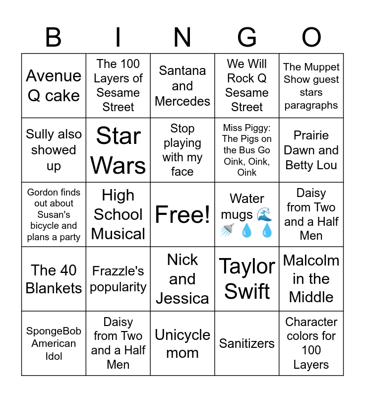This bingo card has a free space and 52 words: 45 Muppets list, Character colors for 100 Layers, Three videos (Ah! Ah! Ah! Ah! đŠī¸), Unicycle mom, Frazzle's popularity, Forgetting to turn on the fan, The 100 Layers of Sesame Street, Often slow on the uptake, Sully also showed up, Ashley Tisdale đ˛ 𩷠𩷠đ, Star Wars, Peppa Pig vibrant colors, Malcolm in the Middle, Taylor Swift, Stop playing with my mouth, Stop playing with my nose, Stop playing with my face, Water mugs đ đŋ đ§ đ§, Miley Cyrus, The Muppet Show guest stars paragraphs, High School Musical, Sanitizers, Avenue Q cake, Miss Piggy: The Pigs on the Bus Go Oink, Oink, Oink, Candace's blue pants, Gina is older and wears glasses đ¤ĸ, Fran Brill, Two-Headed Monster Violet đ, Prairie Dawn and Betty Lou, Joan Crawford, The Mixtures, We Will Rock Q Sesame Street, Ross from Friends, Bear outtake, Rizzo and Frazzle ruin Glee, Santana and Mercedes, Daisy from Two and a Half Men, Claire's mom for Nicky, Denise Nickerson, The Muppets are kind of cartoon characters themselves, Hamilton Hocks, Daisy from Two and a Half Men, The 40 Blankets, Rocky Mountain Bosses Lament, Nick and Jessica, Fairly Odd Problem, Gift bags, Gordon finds out about Susan's bicycle and plans a party, Talking problem, Rose from Two and a Half Men, SpongeBob American Idol and Trixie Tang takes Timmy on her bicycle.
