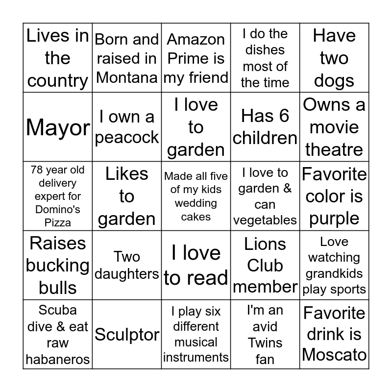 This bingo card has a free space and 30 words: Sculptor, Drive a 15 year old car, Likes to garden, Holds H.S. Gymnastic Record, Lives in the country, Amazon Prime is my friend, I own a peacock, I love to read, I love to garden & can vegetables, I play six different musical instruments, Favorite color is purple, Favorite drink is Moscato, I'm an avid Twins fan, I live on a farm, Owns a movie theatre, Likes to volunteer in community, Lions Club member, Raises bucking bulls, Two daughters, Have two dogs, 78 year old delivery expert for Domino's Pizza, Living on a farm that's been 100 years in family, Born and raised in Montana, Has 6 children, Mayor, I do the dishes most of the time, Love watching grandkids play sports, Scuba dive & eat raw habaneros, I love to garden and I have 3 grandsons under 3 years old.