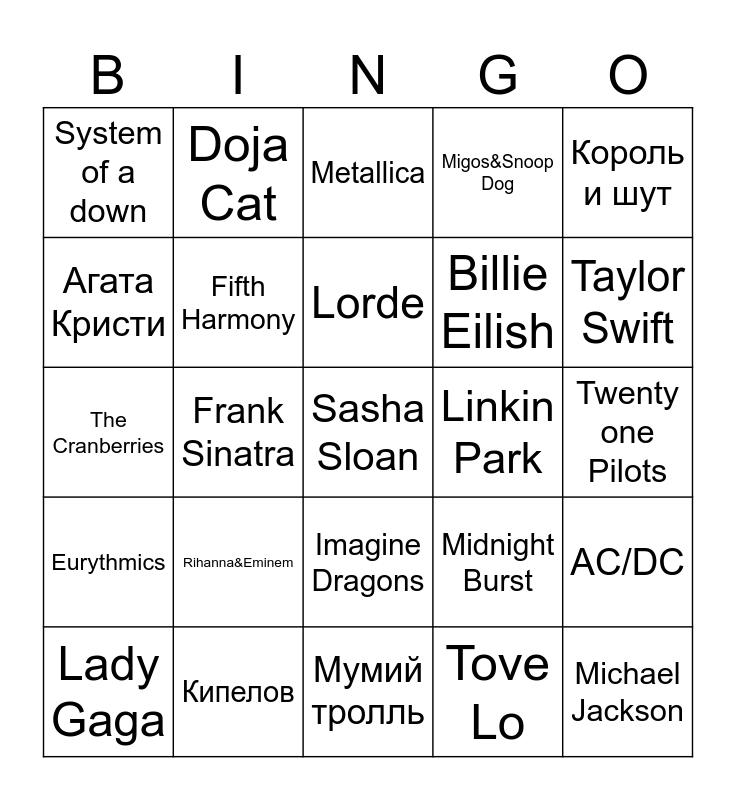 This bingo card has 25 words: Rihanna&Eminem, Мумий тролль, Lorde, Lady Gaga, Король и шут, System of a down, Агата Кристи, Doja Cat, Linkin Park, Imagine Dragons, Billie Eilish, The Cranberries, Midnight Burst, AC/DC, Fifth Harmony, Michael Jackson, Twenty one Pilots, Metallica, Taylor Swift, Frank Sinatra, Sasha Sloan, Кипелов, Eurythmics, Migos&Snoop Dog and Tove Lo.