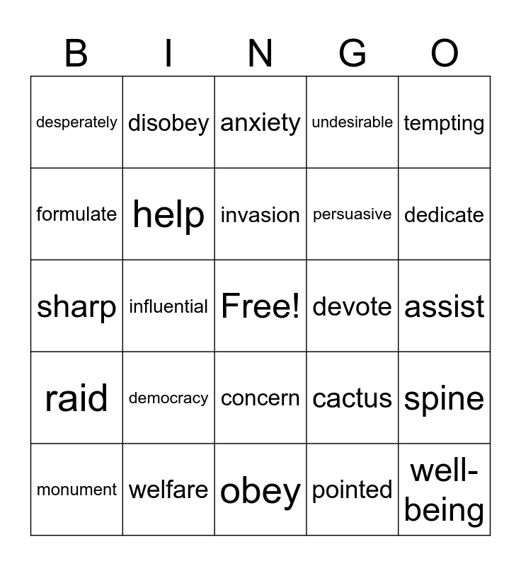 This bingo card has a free space and 24 words: democracy, welfare, invasion, monument, tempting, desperately, formulate, disobey, devote, concern, persuasive, sharp, cactus, spine, help, pointed, assist, anxiety, dedicate, influential, well-being, raid, undesirable and obey.