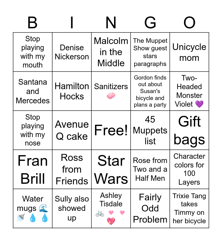 This bingo card has a free space and 55 words: Candace's blue pants, Water mugs ๐ ๐ฟ ๐ง ๐ง, Miss Piggy: The Pigs on the Bus Go Oink, Oink, Oink, Stop playing with my mouth, Ashley Tisdale ๐ฒ ๐ฉท ๐ฉท ๐, Joan Crawford, Hamilton Hocks, Often slow on the uptake, Gordon finds out about Susan's bicycle and plans a party, Daisy from Two and a Half Men, The Muppet Show guest stars paragraphs, High School Musical, Rizzo and Frazzle ruin Glee, The Muppets are kind of cartoon characters themselves, Community, Nick and Jessica, Unicycle mom, Avenue Q cake, Bear outtake, Trixie Tang takes Timmy on her bicycle, 45 Muppets list, Prairie Dawn and Betty Lou, Rose from Two and a Half Men, Malcolm in the Middle, The Mixtures, Sanitizers ๐งผ, Fairly Odd Problem, The 40 Blankets, Gift bags, Character colors for 100 Layers, Forgetting to turn on the fan, Stop playing with my face, Claire's mom for Nicky, Miley Cyrus, Santana and Mercedes, Stop playing with my nose, Peppa Pig vibrant colors, Fran Brill, Gina is older and wears glasses ๐คข, Daisy from Two and a Half Men, Denise Nickerson, Rocky Mountain Bosses Lament, Frazzle's popularity, Rizzo and Frazzle are both way too overused!, Ross from Friends, Sully also showed up, SpongeBob American Idol, Three videos (Ah! Ah! Ah! Ah! ๐ฉ๏ธ), We Will Rock Q Sesame Street, Two-Headed Monster Violet ๐, The 100 Layers of Sesame Street, Community bicycle seating (with Pierce as Boober Fraggle) ๐งบ, Taylor Swift, Star Wars and Talking problem.