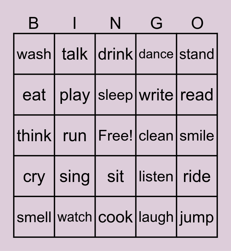 This bingo card has a free space and 25 words: smell, sing, sleep, laugh, read, wash, talk, drink, write, ride, think, play, listen, jump, eat, watch, cook, dance, smile, cry, run, sit, clean, stand and walk.