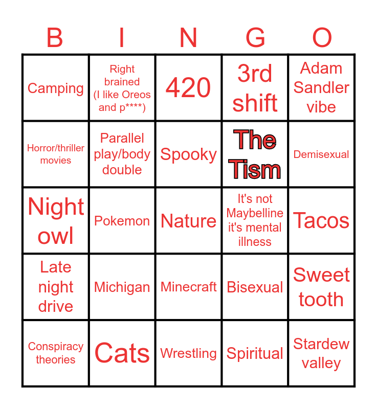 This bingo card has a free space and 24 words: Michigan, Cats, Spooky, Conspiracy theories, Adam Sandler vibe, Camping, Horror/thriller movies, Right brained (I like Oreos and p****), It's not Maybelline it's mental illness, Minecraft, The Tism, Night owl, Bisexual, Sweet tooth, Parallel play/body double, Spiritual, Tacos, 420, Demisexual, Pokemon, Stardew valley, Late night drive, 3rd shift and Wrestling.
