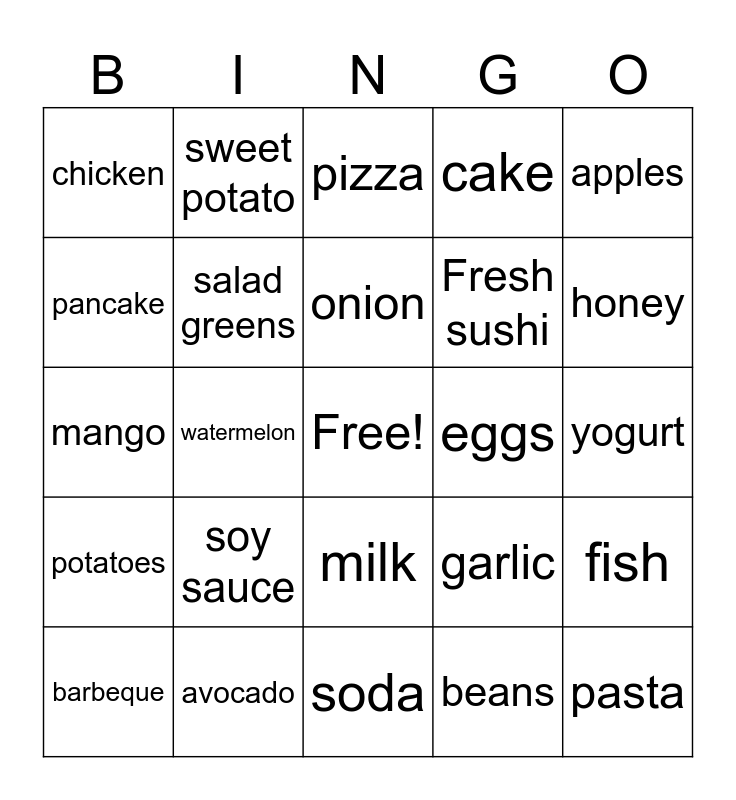 This bingo card has a free space and 30 words: avocado, strawberries, watermelon, rice, chicken, pizza, salad greens, milk, eggs, soda, yogurt, pasta, beans, cheese, honey, peas, garlic, potatoes, soy sauce, apples, mango, cucumber, sweet potato, Fresh sushi, pancake, cake, fish, barbeque, onion and chili.