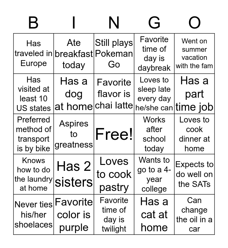 This bingo card has a free space and 24 words: Has 2 sisters, Favorite color is purple, Favorite flavor is chai latte, Never ties his/her shoelaces, Went on summer vacation with the fam, Has traveled in Europe, Has visited at least 10 US states, Ate breakfast today, Works after school today, Loves to cook pastry, Loves to sleep late every day he/she can, Preferred method of transport is by bike, Wants to go to a 4-year college, Expects to do well on the SATs, Has a dog at home, Has a cat at home, Loves to cook dinner at home, Still plays Pokeman Go, Has a part time job, Aspires to greatness, Can change the oil in a car, Knows how to do the laundry at home, Favorite time of day is daybreak and Favorite time of day is twilight.