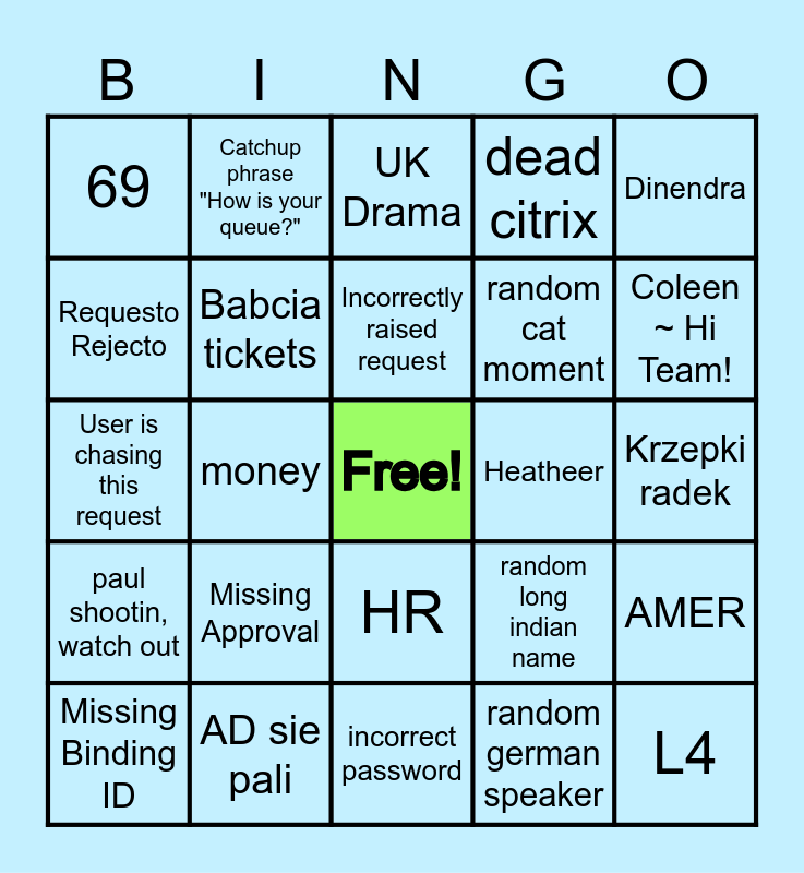 This bingo card has a free space and 24 words: Missing Binding ID, Missing Approval, Incorrectly raised request, random german speaker, Dinendra, 69, Catchup phrase "How is your queue?", UK Drama, Heatheer, Krzepki radek, User is chasing this request, Babcia tickets, random long indian name, AMER, Requesto Rejecto, AD sie pali, incorrect password, dead citrix, Coleen ~ Hi Team!, paul shootin, watch out, money, HR, random cat moment and L4.