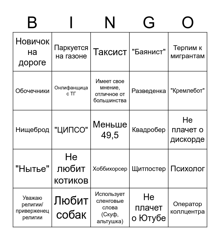This bingo card has a free space and 24 words: Не любит котиков, Любит собак, Имеет свое мнение, отличное от большинства, Уважаю религии/приверженец религии, Терпим к мигрантам, Новичок на дороге, Обочечники, Паркуется на газоне, Квадробер, Хоббихорсер, Разведенка, Нищеброд, Щитпостер, Психолог, Онлифанщица с ТГ, Не плачет о Ютубе, Не плачет о дискорде, Таксист, "Кремлебот", "ЦИПСО", Оператор коллцентра, "Нытье", "Баянист" and Использует сленговые слова (Скуф, альтушка).