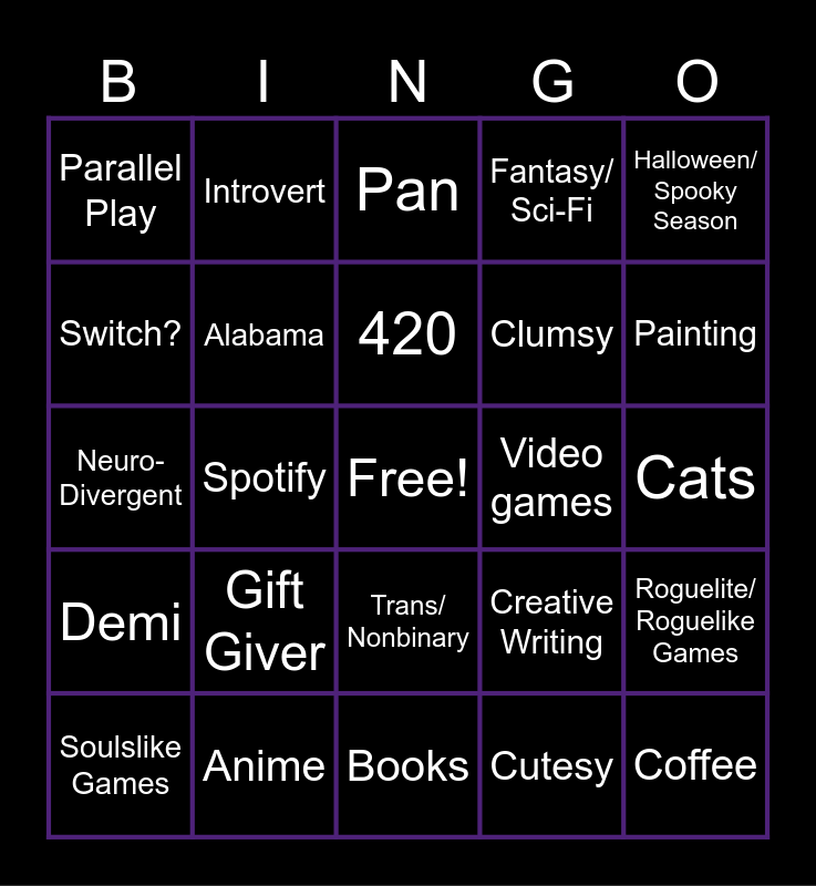 This bingo card has a free space and 24 words: Gift Giver, Anime, 420, Soulslike Games, Halloween/ Spooky Season, Parallel Play, Switch?, Introvert, Video games, Trans/ Nonbinary, Clumsy, Neuro- Divergent, Creative Writing, Roguelite/ Roguelike Games, Alabama, Cutesy, Cats, Pan, Painting, Spotify, Coffee, Demi, Fantasy/ Sci-Fi and Books.