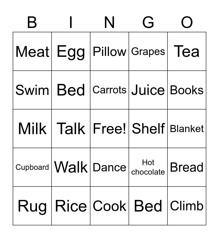 This bingo card has a free space and 29 words: Rug, Run, Talk, Jump, Meat, Pillow, Bed, Walk, Shelf, Rice, Blanket, Climb, Cook, Bed, Books, Board, Dance, Cupboard, Tea, Milk, Hot chocolate, Fly, Juice, Swim, Grapes, Egg, Bread, Carrots and Fish.