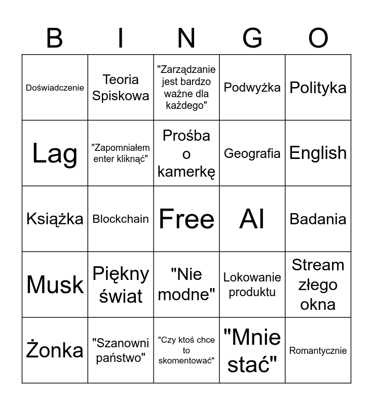 This bingo card has a free space and 24 words: Piękny świat, "Szanowni państwo", Prośba o kamerkę, Żonka, Polityka, Doświadczenie, Lag, Teoria Spiskowa, AI, "Nie modne", Geografia, Książka, Lokowanie produktu, Stream złego okna, "Zapomniałem enter kliknąć", "Mnie stać", Badania, "Zarządzanie jest bardzo ważne dla każdego", English, Blockchain, Romantycznie, Musk, Podwyżka and "Czy ktoś chce to skomentować".