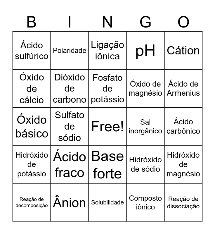 Bingo Químico | Bingo Químico | SAIS INORGÂNICOS | BINGO QUÍMICA | BINGO QUÍMICA