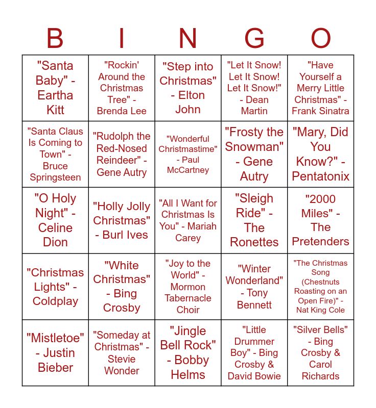 This bingo card has 51 words: Free!, "All I Want for Christmas Is You" - Mariah Carey, "Last Christmas" - Wham!, "Jingle Bell Rock" - Bobby Helms, "White Christmas" - Bing Crosby, "Feliz Navidad" - José Feliciano, "Rockin' Around the Christmas Tree" - Brenda Lee, "It's the Most Wonderful Time of the Year" - Andy Williams, "Santa Claus Is Coming to Town" - Bruce Springsteen, "Christmas (Baby Please Come Home)" - Darlene Love, "Rudolph the Red-Nosed Reindeer" - Gene Autry, "Let It Snow! Let It Snow! Let It Snow!" - Dean Martin, "The Christmas Song (Chestnuts Roasting on an Open Fire)" - Nat King Cole, "Winter Wonderland" - Tony Bennett, "Happy Xmas (War Is Over)" - John Lennon & Yoko Ono, "Do They Know It's Christmas?" - Band Aid, "Wonderful Christmastime" - Paul McCartney, "Sleigh Ride" - The Ronettes, "Blue Christmas" - Elvis Presley, "Have Yourself a Merry Little Christmas" - Frank Sinatra, "Holly Jolly Christmas" - Burl Ives, "Little Drummer Boy" - Bing Crosby & David Bowie, "Santa Baby" - Eartha Kitt, "Frosty the Snowman" - Gene Autry, "Jingle Bells" - Frank Sinatra, "Silver Bells" - Bing Crosby & Carol Richards, "Mary, Did You Know?" - Pentatonix, "Peace on Earth/Little Drummer Boy" - Bing Crosby & David Bowie, "Mistletoe" - Justin Bieber, "Step into Christmas" - Elton John, "Christmas Time Is Here" - Vince Guaraldi Trio, "I Saw Mommy Kissing Santa Claus" - Jackson 5, "Run Rudolph Run" - Chuck Berry, "Merry Christmas Darling" - The Carpenters, "Please Come Home for Christmas" - Eagles, "Someday at Christmas" - Stevie Wonder, "Christmas in Hollis" - Run-D.M.C., "Christmas Wrapping" - The Waitresses, "This Christmas" - Donny Hathaway, "Little Saint Nick" - The Beach Boys, "2000 Miles" - The Pretenders, "Christmas Lights" - Coldplay, "Do You Hear What I Hear?" - Whitney Houston, "Christmas Eve/Sarajevo 12/24" - Trans-Siberian Orchestra, "Silver and Gold" - Burl Ives, "The First Noel" - Josh Groban, "O Holy Night" - Celine Dion, "Deck the Halls" - Mannheim Steamroller, "Silent Night" - Sinead O'Connor, "Joy to the World" - Mormon Tabernacle Choir and "Carol of the Bells" - Pentatoni.