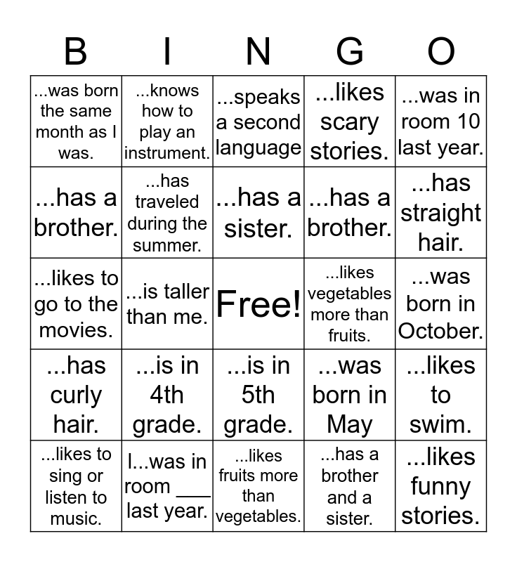 This bingo card has a free space and 24 words: ...is in 4th grade., l...was in room ___ last year., ...has a sister., ...likes to sing or listen to music., ...was in room 10 last year., ...was born the same month as I was., ...has a brother., ...knows how to play an instrument., ...likes vegetables more than fruits., ...is in 5th grade., ...has a brother., ...likes to go to the movies., ...was born in May, ...likes to swim., ...has traveled during the summer., ...has a brother and a sister., ...was born in October., ...speaks a second language, ...has straight hair., ...is taller than me., ...likes funny stories., ...has curly hair., ...likes scary stories. and ...likes fruits more than vegetables..