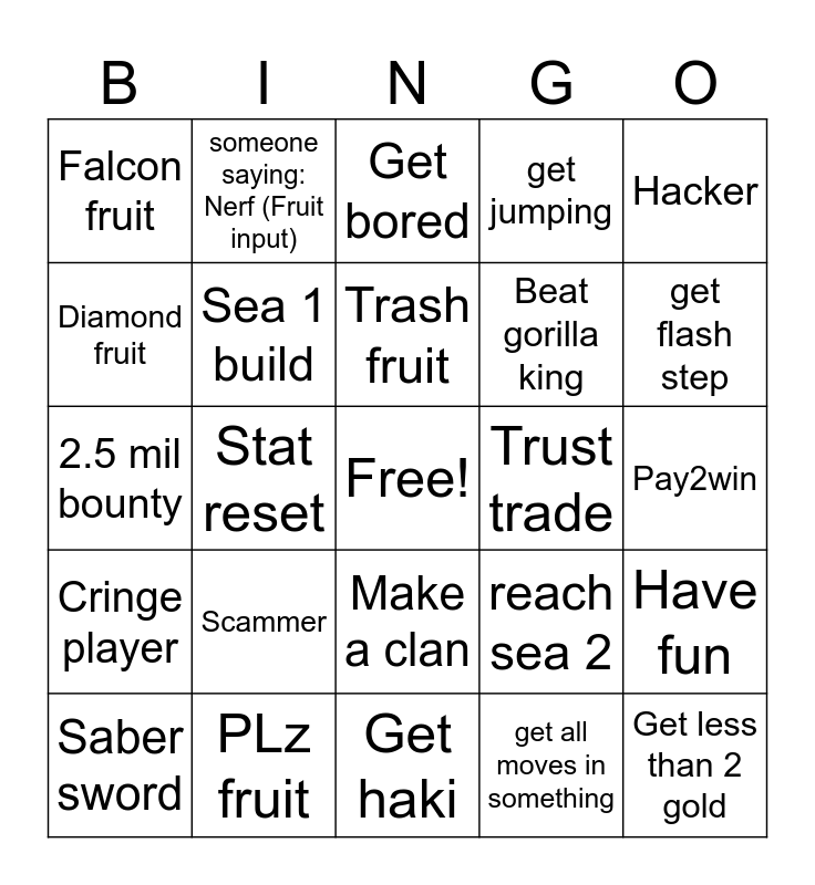 This bingo card has a free space and 24 words: Scammer, PLz fruit, Trash fruit, Saber sword, Hacker, Falcon fruit, Diamond fruit, someone saying: Nerf (Fruit input), Trust trade, Make a clan, Beat gorilla king, 2.5 mil bounty, reach sea 2, Have fun, Sea 1 build, get all moves in something, Pay2win, Get bored, get flash step, Stat reset, Get less than 2 gold, Cringe player, get jumping and Get haki.