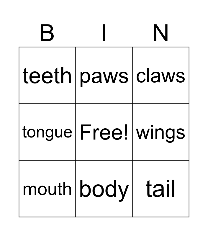 This bingo card has a free space and 9 words: mouth, claws, paws, tongue, teeth, wings, tail, whiskers and body.