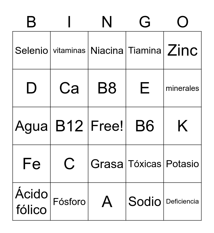 This bingo card has a free space and 24 words: C, Fósforo, B8, Ácido fólico, Zinc, Selenio, D, vitaminas, B6, Grasa, E, Agua, Tóxicas, Potasio, Ca, Sodio, K, Niacina, minerales, B12, Deficiencia, Fe, Tiamina and A.