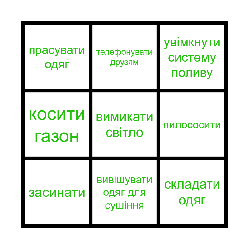 This bingo card has 9 words: засинати, вимикати світло, увімкнути систему поливу, прасувати одяг, телефонувати друзям, пилососити, косити газон, вивішувати одяг для сушіння and складати одяг.