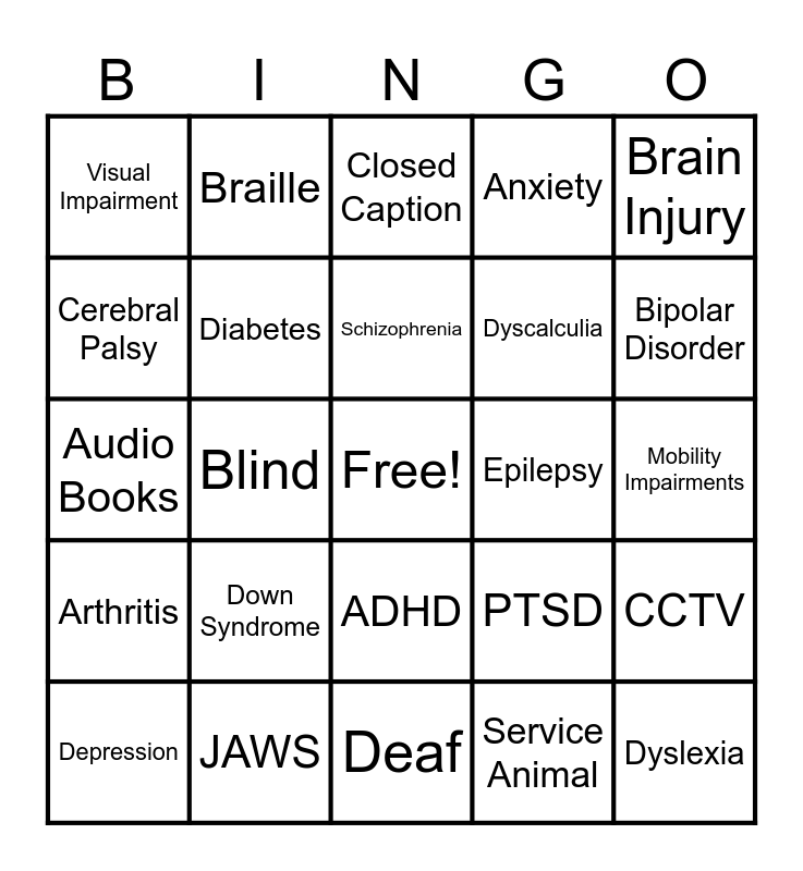 This bingo card has a free space and 39 words: Autism, Hearing Impairment, OCD, Diabetes, Depression, ADHD, Schizophrenia, Autoimmune Disorder, Brain Injury, Arthritis, Blind, Anxiety, Dyslexia, Mobility Impairments, Epilepsy, Down Syndrome, ADD, Visual Impairment, Tourette Syndrome, PTSD, Cerebral Palsy, Deaf, Dyscalculia, Bipolar Disorder, Extra Time, Notetaker, Table, Chair, Testing Center, Braille, ASL, Audio Recorder, Closed Caption, JAWS, Service Animal, Preferential Seating, CCTV, Audio Books and Large print.