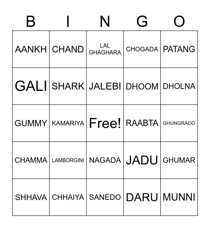 This bingo card has a free space and 40 words: GUMGUM, GUMMY, CHA CHA SLIDE, SHARK, CHHAIYA, NAGADA, JALEBI, PICHKARI, PATANG, CHAMMA, KAMARIYA, CHOGADA, MUNNI, GHUNGRAOO, RAABTA, LAMBORGINI, CHASMA, AANKH, BAAT, LAL GHAGHARA, GHUMAR, DARU, DHOOM, GALI, HEEL, LONDON, PARTY, DILBAR, ZINGAAD, CHARACTER, ZUMKA, SHHAVA, GARMI, JADU, DHOLNA, SANEDO, GOTILO, MUQABALA, CHAND and HAVAYEIN.