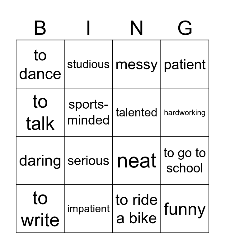 This bingo card has 28 words: Free!, Artistic, daring, good, sports-minded, messy, studious, funny, impatient, intelligent, neat, patient, lazy, shy, serious, friendly, sociable, talented, hardworking, to sing, to dance, to study, to write, to go to school, to ride a bike, to listen to music, to talk and to work.