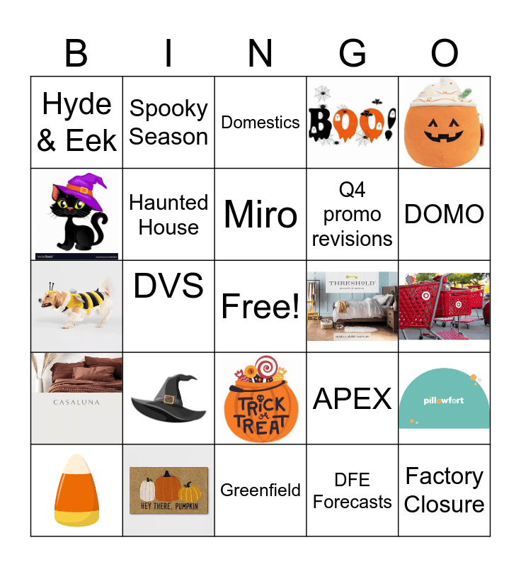 This bingo card has 18 images, a free space and 19 words: Full moon, GTKY, Haunted House, Miro, East Coast Port Closure, Bats, DVS, Factory Closure, Out of Stock, Domestics, Hyde & Eek, DOMO, Greenfield, DFE Forecasts, Spooky Season, DVS Vendor, APEX, Q4 promo revisions and Domestics.