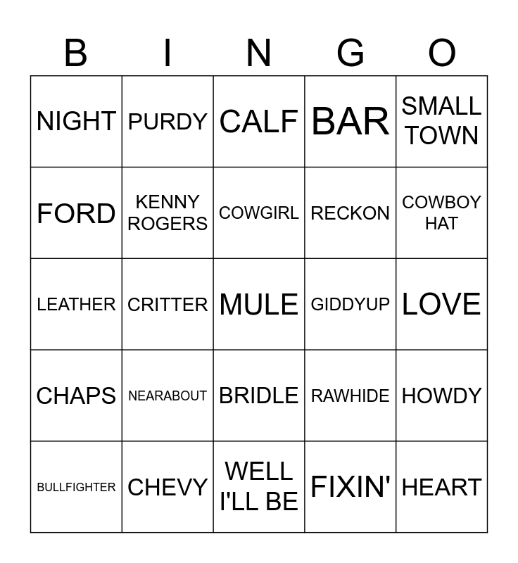 This bingo card has 113 words: Free!, 4X4, AIN'T, AIN'T OUR FIRST RODEO, AMERICA, ANVIL, BAR, BARBED WIRE, BAREFOOT, BARKING UP THE WRONG TREE, BARREL RACING, BLESS YOUR HEART, BOLO, BONFIRE, BOOTS, BRAND, BRIDLE, BROOKS & DUNN, BUCKING BRONCO, BULL, BULLFIGHTER, CALF, CAMPING, CATTLE, CHANNING WILSON, CHAPS, CHEVY, CODY JOHNSON, COW, COWBOY, COWBOY HAT, COWGIRL, CRITTER, DALLY, DARN TOOTIN', DENIM, DIRT, DIRT ROAD, DJ SLIM MCGRAW, DOG, DOLLY PARTON, DRINK, DRIVE, FARRIER, FISHING, FIT AS A FIDDLE, FIXIN', FORD, FULL AS A TICK, GARTH BROOKS, GEORGE STRAIT, GIDDYUP, GREENVILLE COUNTRY MUSIC FEST, GUITAR, HALTER, HARNESS, HEART, HOG TIE, HOLD YOUR HORSES, HORSES, HOWDY, HUNKERING, HUNKEY DOREY, HUNT, JEEP, JOHNNY CASH, JUNE BUG, KENNY ROGERS, LEATHER, LICKETY-SPLIT, LOVE, MA'AM, MARE, MAVERICK, MUDDING, MULE, NEARABOUT, NIGHT, ORNERY, PORCH, PRETTY AS A PEACH, PURDY, RADIO, RAWHIDE, RECKON, RIDING, RODEO, ROUNDUP, RUST, SADDLE, SIR, SKEDADDLE, SMALL TOWN, SNUG AS A BUG, SPUR, STAGE, STIRRUP, TARNATION, THAT DOG WON'T HUNT, TOO BIG FOR YOUR BRITCHES, TOTE, TRACTOR, TRUCK, TWANG, UPPITY, VARMINT, WELL I'LL BE, WILLIE NELSON, WRANGLER, Y'ALL, YANKEE, YEEHAW and YONDER.