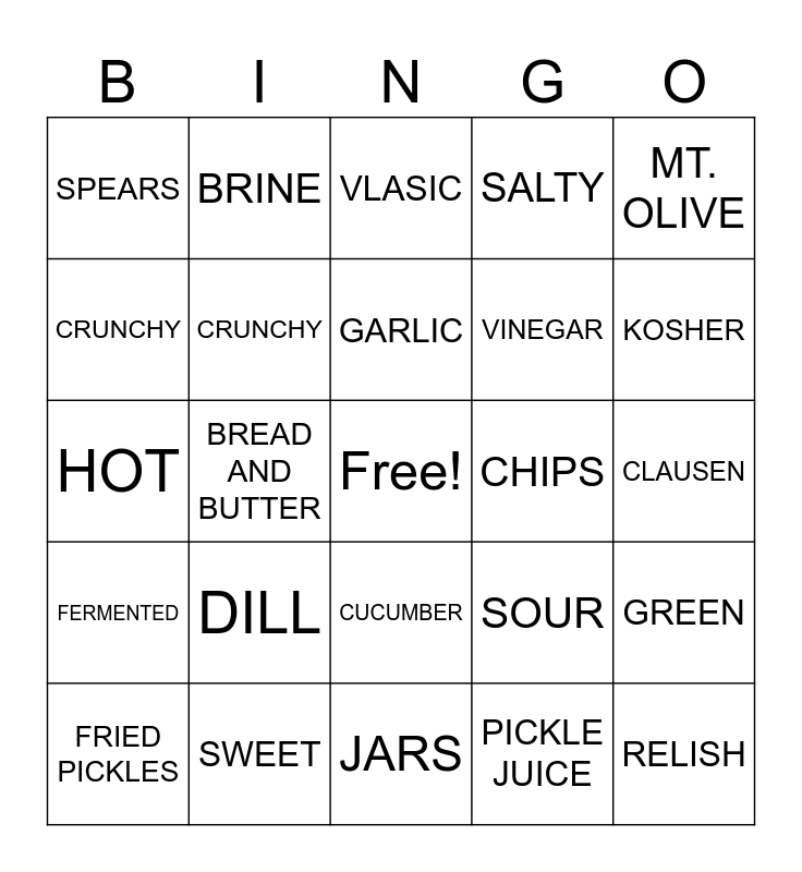 This bingo card has a free space and 24 words: DILL, SWEET, GARLIC, FRIED PICKLES, MT. OLIVE, SPEARS, CRUNCHY, BRINE, CHIPS, CUCUMBER, VINEGAR, HOT, SOUR, GREEN, CRUNCHY, PICKLE JUICE, CLAUSEN, VLASIC, KOSHER, BREAD AND BUTTER, RELISH, FERMENTED, SALTY and JARS.