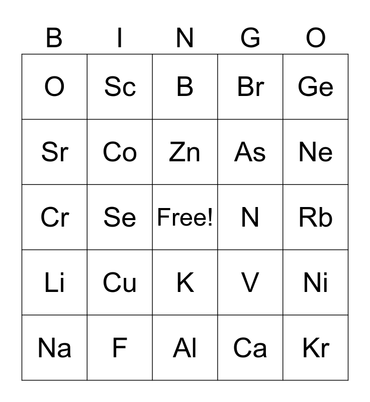 This bingo card has a free space and 38 words: H, He, Fe, Co, Ni, Cu, Zn, Ga, Ge, As, Se, Br, Kr, Rb, Sr, Li, Be, B, C, N, O, F, Ne, Na, Mg, Al, Si, P, S, Cl, Ar, K, Ca, Sc, Ti, V, Cr and Mn.