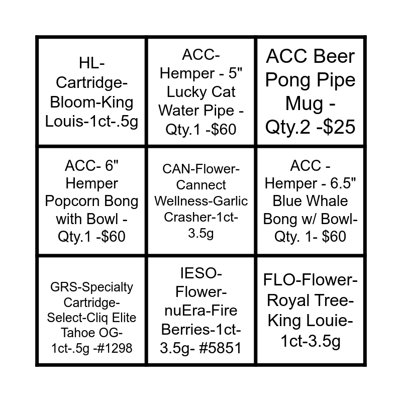 This bingo card has 9 words: GRS-Specialty Cartridge-Select-Cliq Elite Tahoe OG-1ct-.5g -#1298, ACC Beer Pong Pipe Mug -Qty.2 -$25, ACC- Hemper - 5" Lucky Cat Water Pipe - Qty.1 -$60, ACC- 6" Hemper Popcorn Bong with Bowl -Qty.1 -$60, HL-Cartridge-Bloom-King Louis-1ct-.5g, ACC - Hemper - 6.5" Blue Whale Bong w/ Bowl- Qty. 1- $60, CAN-Flower-Cannect Wellness-Garlic Crasher-1ct-3.5g, FLO-Flower-Royal Tree-King Louie-1ct-3.5g and IESO-Flower-nuEra-Fire Berries-1ct-3.5g- #5851.