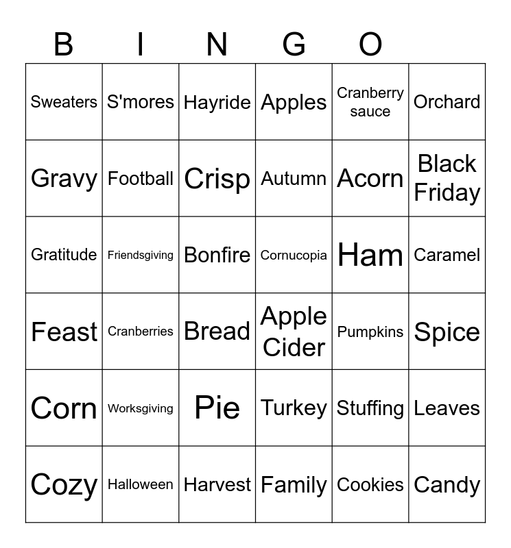 This bingo card has 36 words: Turkey, Pie, Family, Gravy, Feast, Cornucopia, Football, Harvest, Cranberry sauce, Stuffing, Black Friday, Apples, Leaves, Friendsgiving, Autumn, Sweaters, Corn, Ham, Gratitude, Hayride, Bonfire, Cranberries, Apple Cider, Bread, Pumpkins, S'mores, Acorn, Halloween, Crisp, Orchard, Candy, Cozy, Spice, Caramel, Worksgiving and Cookies.