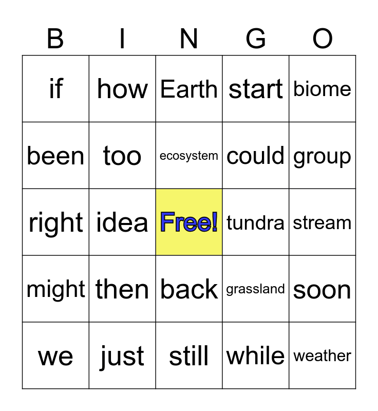 This bingo card has a free space and 24 words: then, just, ecosystem, we, biome, if, been, how, tundra, back, could, right, grassland, soon, too, while, stream, Earth, group, idea, weather, might, start and still.